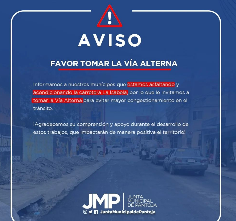 Estamos asfaltando y acondicionando la carretera La Isabela, por lo que le invitamos a tomar la Vía Alterna para evitar mayor congestionamiento en el tránsito.