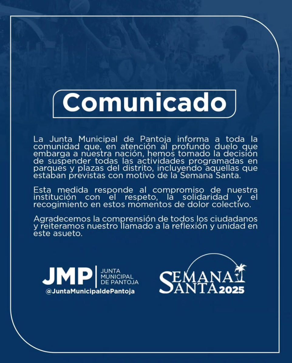 En apego a las decisiones gubernamentales y al duelo que nos embarga como nación, este año nos vemos en la necesidad de suspender todas las actividades, en parques y espacios públicos, que tenemos como tradición realizar durante la Semana Santa.