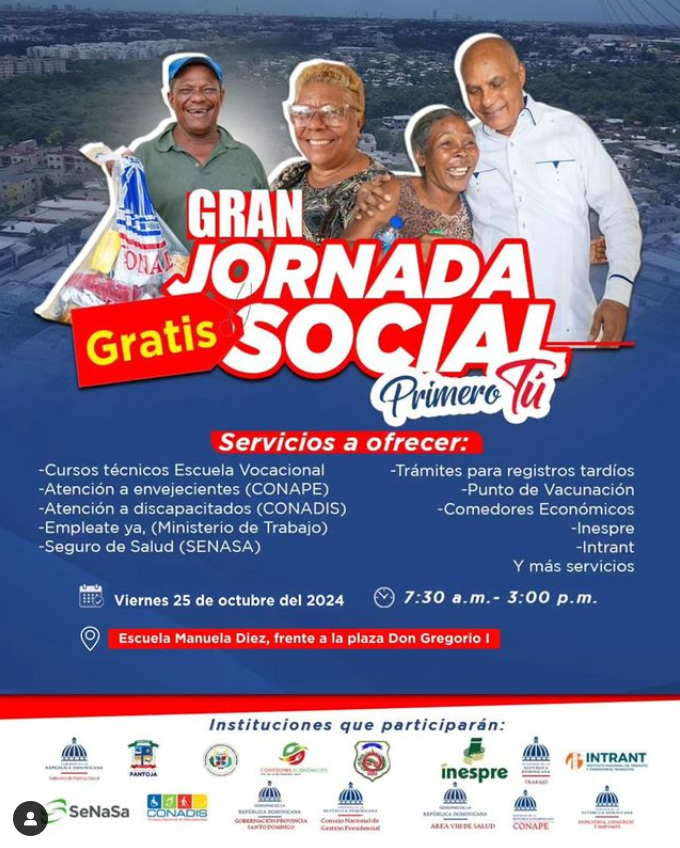 Este viernes, 25 de octubre, en la📍Escuela Manuela Diez (frente a la plaza Don Gregorio I) desde las 7:30 am, hasta las 3:00 pm, podrás acceder a los cursos técnicos de la Escuela Vocacional, a los tramites para registros tardíos, atención a envejecientes, personas con discapacidad y otros servicios.