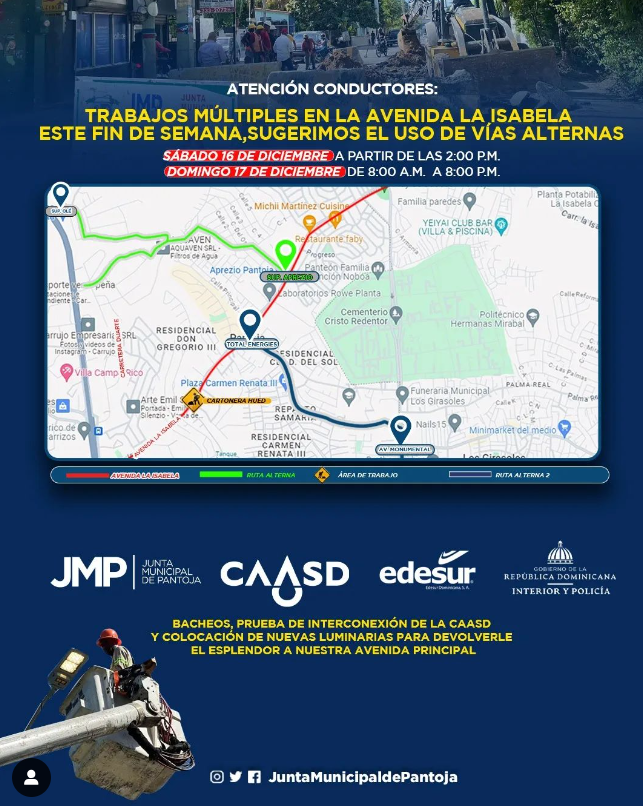 Te invitamos a utilizar las vías alternas, ya que estaremos trabajando, durante este sábado y domingo, en la colocación de luminarias, pruebas de interconexión por parte de la @CAASDRD y continuidad del bacheo en nuestra vía principal.